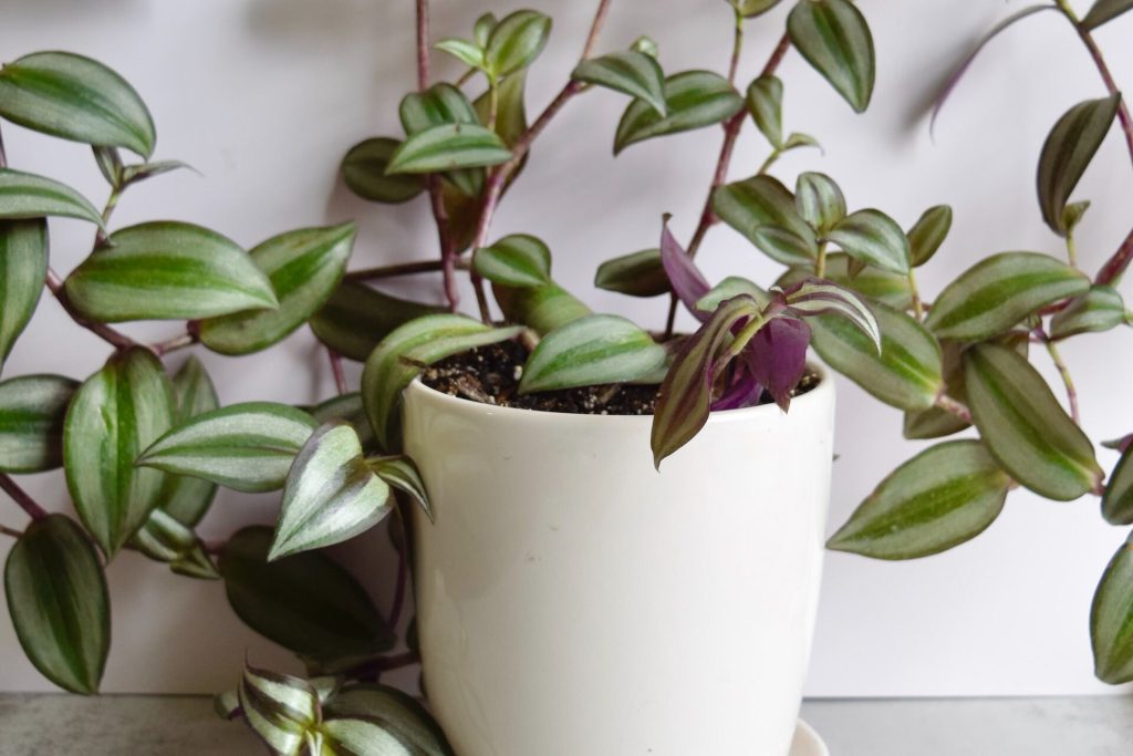 An inch plant (tradescantia zebrina) is an incredibly unique-looking houseplant. The leaves come in various purple colors with a silvery-green accent. Each one grows about an inch apart and has a teardrop-like shape. Depending on how you care for them, they can either be bushy or trailing. It blooms purple or white flowers during spring and summer.