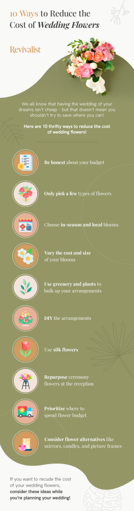 Like with produce, flowers go in and out of season depending on their climate needs. If you want to reduce your floral spending, choose flowers that are in season. You could also select some more popular flowers, like roses, that are generally the same cost year-round.