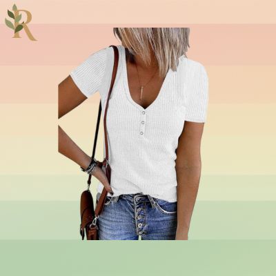 The essence of effortless summer style is a ribbed knit tee. This short-sleeve Henley combines a comfy, stretchy fit with a flattering V-neck and button accents that add a bit of a touch of casual charm. The ribbed texture hugs your figure, creating a sleek yet comfortable look. You can team it up with jeans and sneakers for a simple, stylish daytime look.